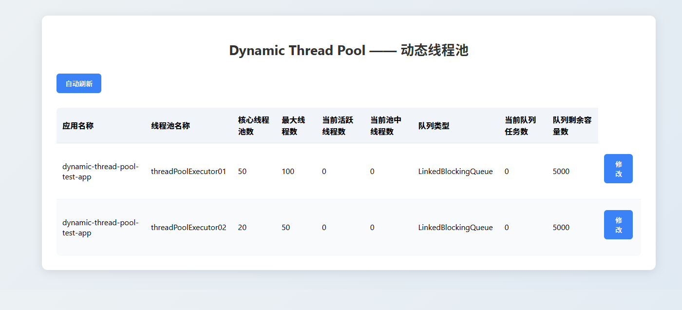 通过以上代码及实现,我们成功构建了一个功能完备的、简单的动态线程池组件,并且附带前端页面来动态配置与监控线程池。这个组件解决了传统线程池的静态配置难题,赋予了应用更强的弹性和可观测性。
