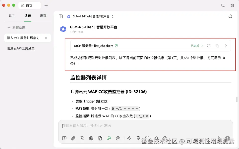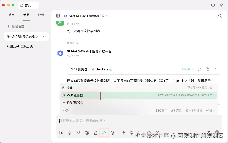 5、回到⾸⻚,选择话题或者助手中点击图标,选择刚刚创建的 MCP(这里以 MCP 服务器为例)