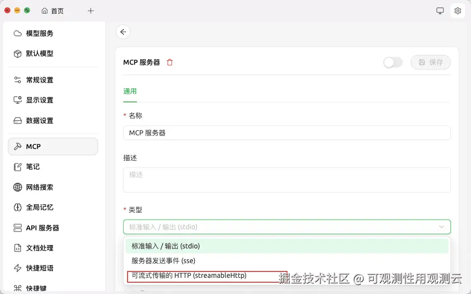 3.1 设置 MCP 服务器名称 (这里以命名 MCP 服务器 为例) 点击类型选择 streamableHttp