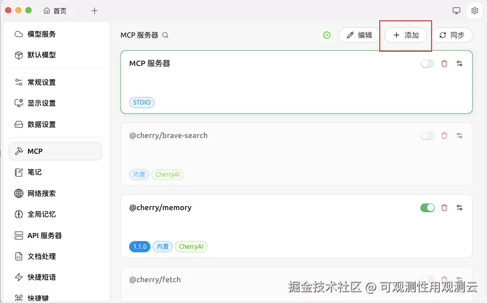 2、打开 Cherry Studio,点击设置,点击 MCP,点击添加