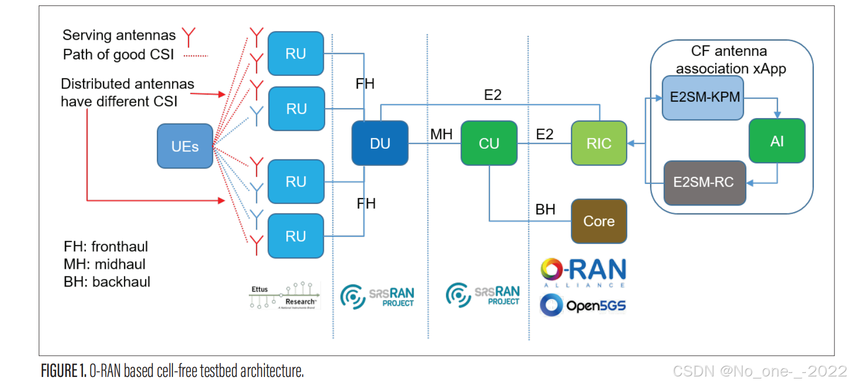 文献 [10] 中的工作提出了全频谱 CF-RAN(full-spectrum CF-RAN)。关键创新包括可扩展的 CF-MIMO 架构和使用商用无线电设备的具有 64 个分布式天线的 CF-MIMO 测试床。该测试床利用精确时间协议 (precision time protocol,PTP) 同步所有无线电设备,并演示了具有自适应 MCS(Adaptive Modulation and Coding Scheme) 和定制 48 端口解调参考信号 (DMRS) 信号的 5G MU-MIMO PHY。