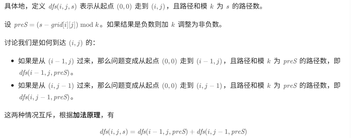 递归入口:题目求从起点 (0,0) 走到 (m−1,n−1),且路径和模 k 为 0 的路径数,即dfs(m−1,n−1,0)