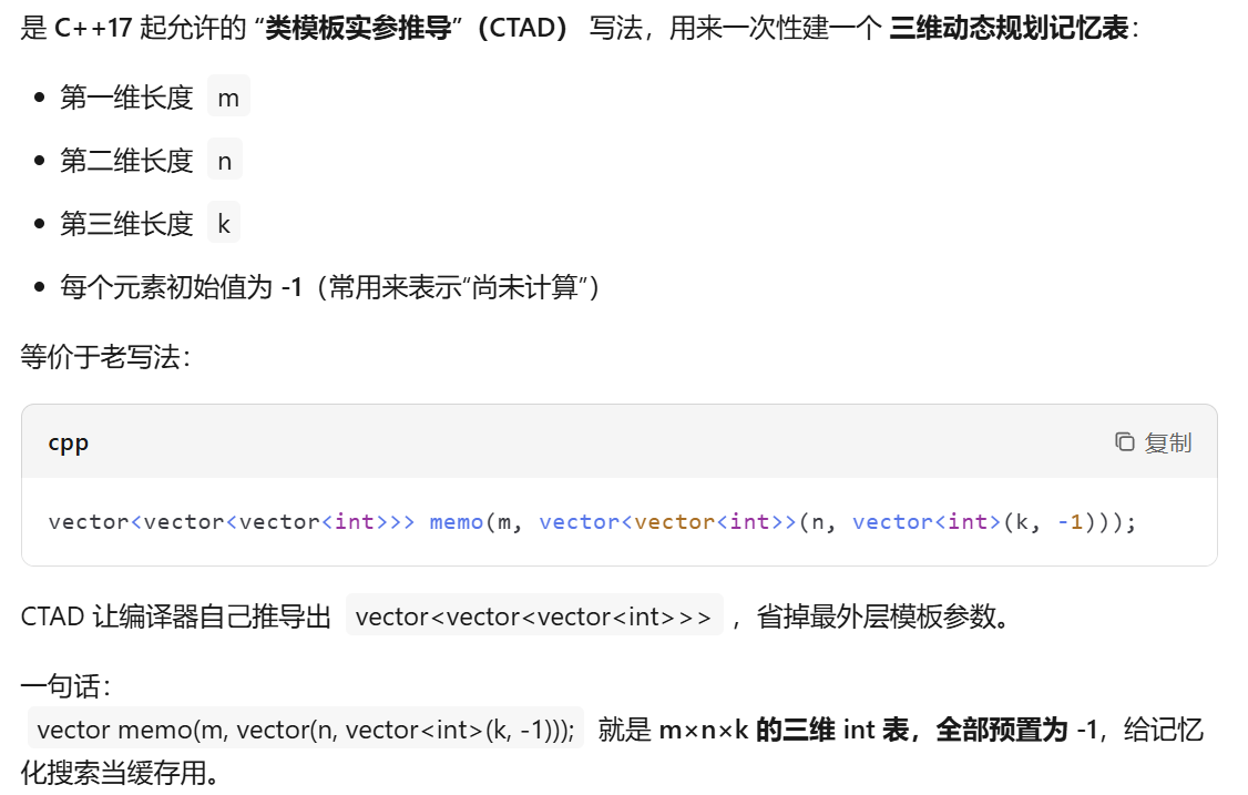 vector memo(m,vector(n,vector<int>(k,-1))); //初始化为-1,表示未遇到过