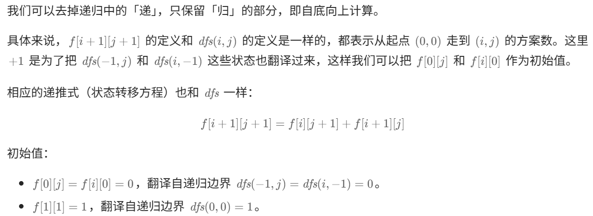 也可以把 f[0][1] 初始化成 1,这样我们无需单独计算 f[1][1]。从 dfs 的角度理解,就是++把 (−1,0) 当作起点,且第一步只能往下走。++