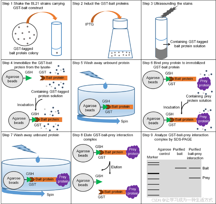 图1 利用原核表达系统检测融合GST ( 谷胱甘肽-S-转移酶)的诱饵蛋白与捕获蛋白互作的Pull-down实验流程图