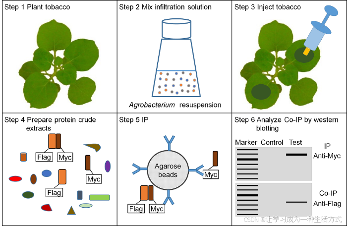 图2 利用烟草瞬时转化体系检测融合Myc的诱饵蛋白与融合Flag的捕获蛋白互作的Co-IP实验流程图