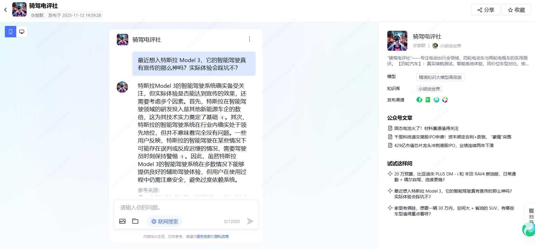 智能体的回答质量依赖于知识库的完整性与时效性。汽车行业新车发布频繁、技术迭代快速,若知识库一成不变,智能体将逐渐失去使用价值。因此,我们建立了"周更新+月复盘"机制:每周通过联网搜索同步新车测评、政策调整等动态信息;每月根据用户交互日志优化知识库结构,补充高频咨询问题的相关内容,让智能体持续保持"专业度"与"新鲜度"。