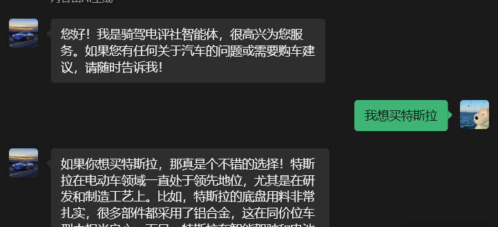 在开发过程中深刻认识到,Agent应用的价值不在于集成多少前沿技术,而在于能否精准解决用户痛点。例如,我们没有盲目堆砌RAG、多Agent协同等复杂技术,而是优先确保"用户提问→智能体理解→精准反馈"的核心流程稳定可靠。对于汽车领域而言,用户需要的是"听得懂、用得上"的建议,因此我们将复杂技术术语转化为通俗表达(如把"插混系统"比喻为"电动车+燃油车结合体"),让智能体真正成为用户的"购车智囊"。