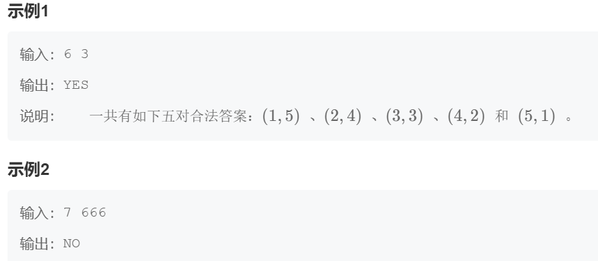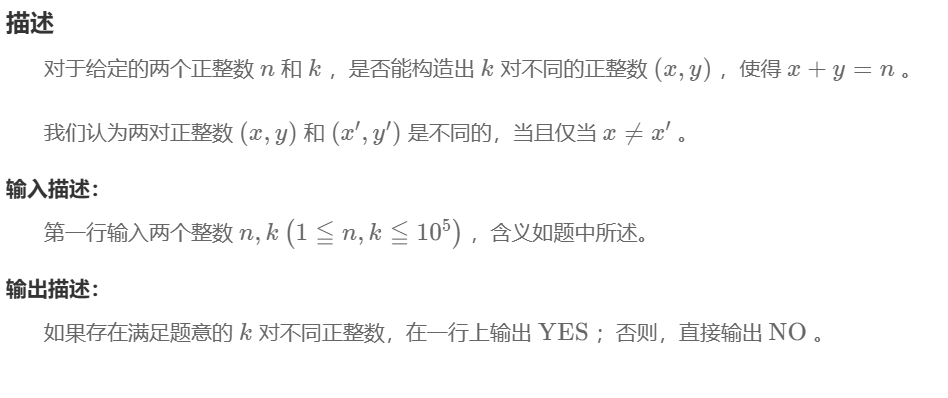我们有两个正整数 n 和 k,要判断能否构造出 k 对不同的正整数 (x,y),使得 x+y=n。