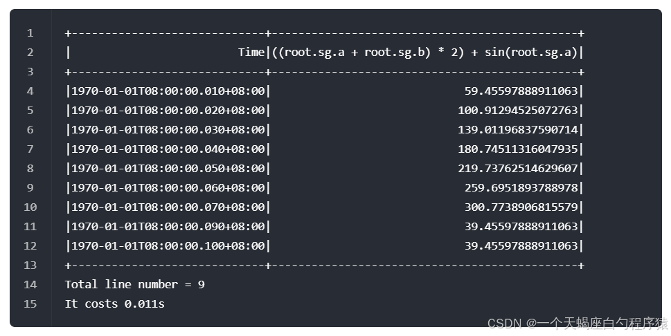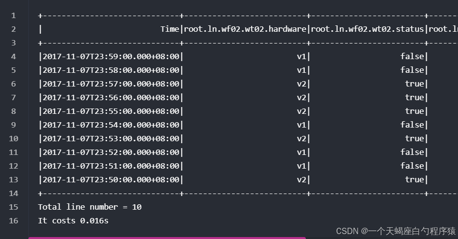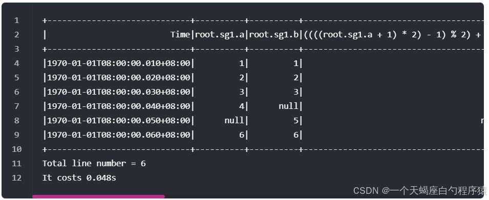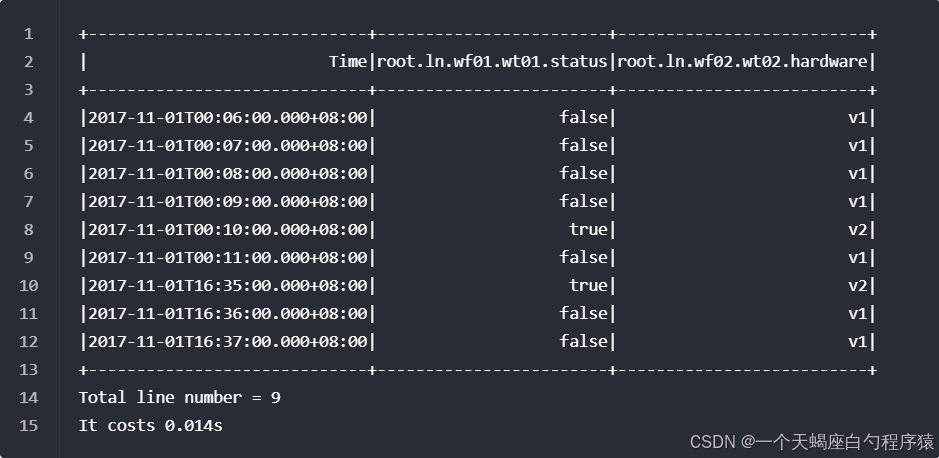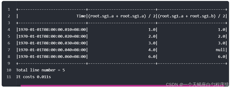 - 查询结果集默认按时间对齐,包含一列时间列和若干个值列,每一行数据各列的时间戳相同