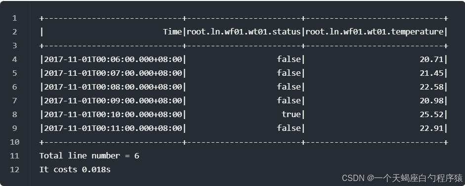 被选择的设备为 ln 集团 wf01 子站 wt01 设备;被选择的时间序列为供电状态(status)和温度传感器(temperature);该语句要求选择出 "2017-11-01T00:05:00.000" 至 "2017-11-01T00:12:00.000" 之间的所选时间序列的值