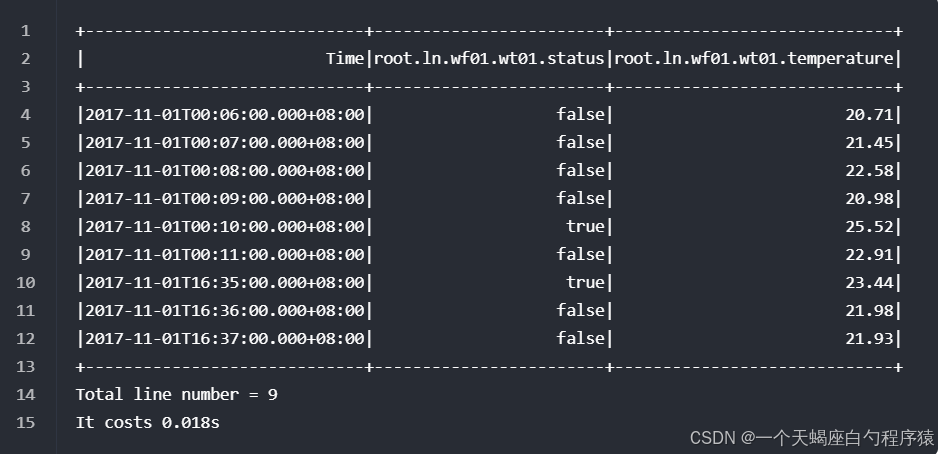 select status, temperature from root.ln.wf01.wt01 where time > 2017-11-01T00:05:00.000 and time < 2017-11-01T00:12:00.000;