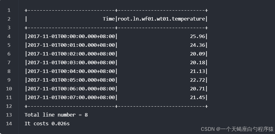 select temperature from root.ln.wf01.wt01 where time < 2017-11-01T00:08:00.000
