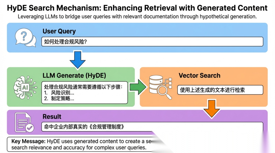 在一些复杂的知识检索场景中,单纯的关键词重写不够用。我们可以使用 HyDE (Hypothetical Document Embeddings) 技术。