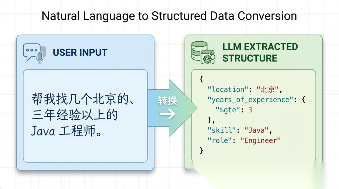 场景示例: 用户输入:"帮我找几个北京的、三年经验以上的 Java 工程师。"