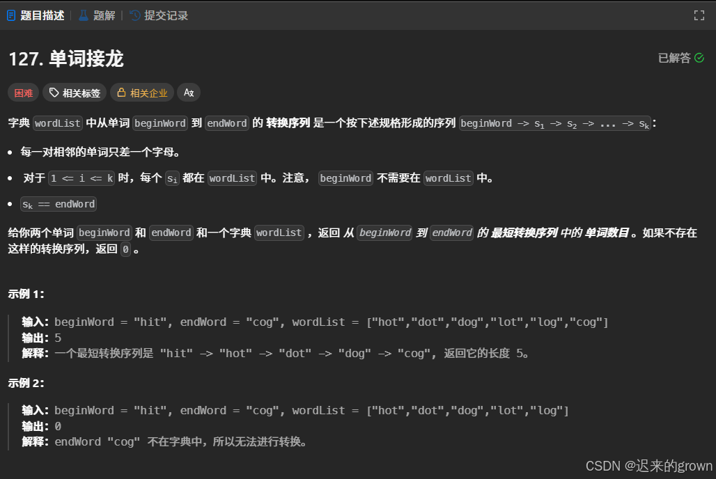 - 初始化:词库转哈希集(快速查询),访问集记录已遍历单词(去重),起始单词入队并标记访问,长度初始为 1。