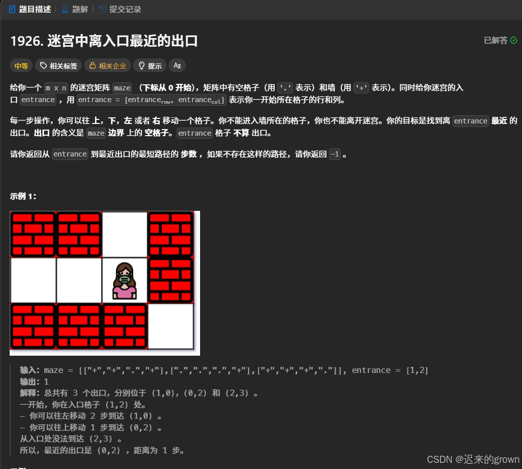 - 方向数组控制上下左右移动,vis 数组标记已访问节点,length 数组记录到入口的步数(初始 - 1)。