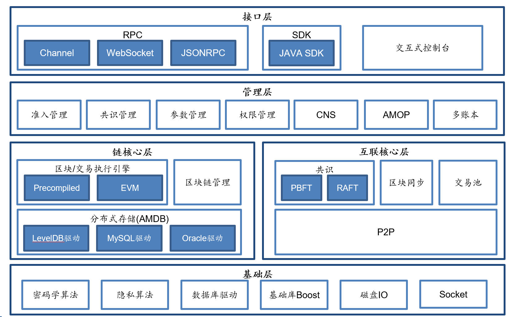管理层: 实现区块链的管理功能,包括参数配置、账本管理和AMOP