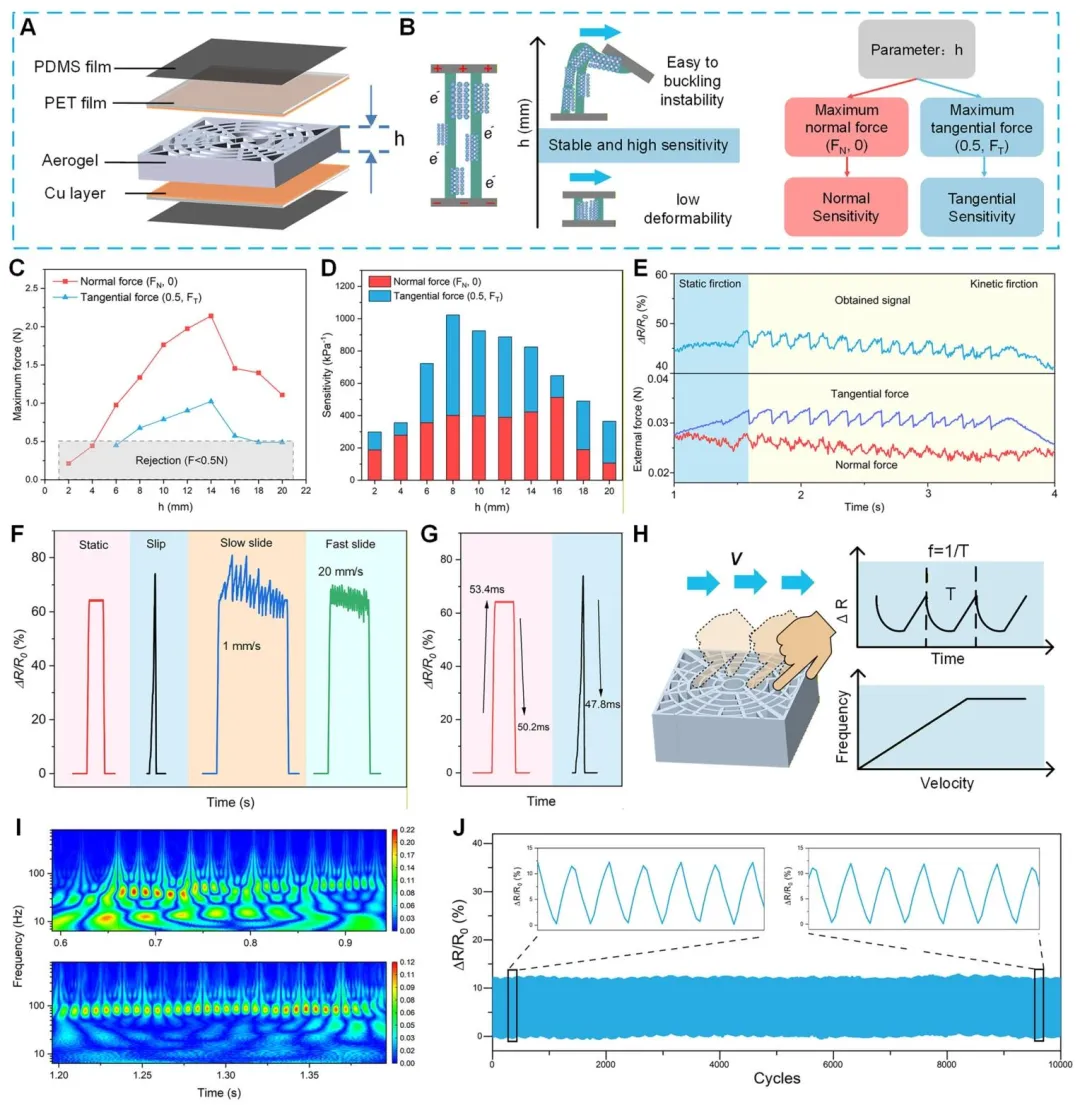 图4. 人工帕西尼小体(APC)传感器用于粘滑触觉传感的增强型切向灵敏度 A)APC传感器结构示意图。 B)(左图)结构高度(h)调控切向灵敏度的机制示意图,用于确定APC传感器的最佳高度;(右图)不同高度的APC在法向力与切向力作用下的灵敏度及承载能力测试结果。 C)不同高度APC样品的最大法向与切向承载能力;D)不同高度APC样品的灵敏度。图中高亮显示了不合格区域。 E)触觉传感器在完整滑动周期内测得的加载力(法向力与切向力)及ΔR/R₀(%)信号。 F)APC传感器对静压力、滑移、慢速滑动(≈1毫米/秒)及快速滑动(20毫米/秒)的响应。 G)APC传感器在静压力与动态滑移下的响应时间与松弛时间。 H)滑移速度(v)与特征频率(f)之间关系的示意图。 I)慢速滑动(上图)与快速滑动(下图)下APC信号的时频图谱。 J)耐久性测试中,APC传感器在10000次周期性加载(滑移速度20毫米/秒)下的ΔR/R₀(%)变化。