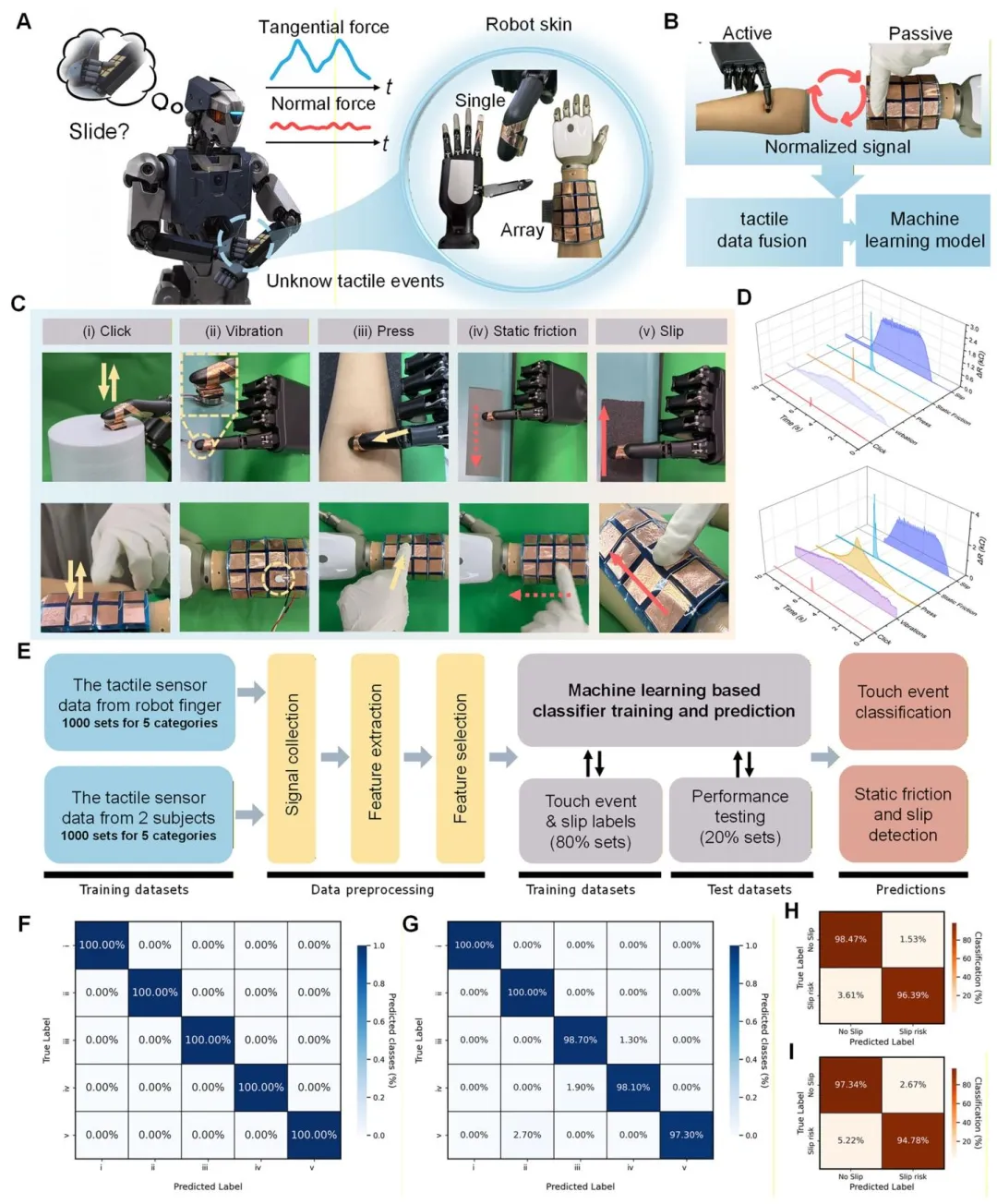 图6. 多维触觉感知增强人机交互 A)搭载APC系统以实现多维触觉传感的仿人机器人示意图。 B)搭载单个APC传感器的机器人手指(用于采集主动触觉信号),以及搭载APC传感器阵列的机器人手臂(用于感知被动触觉信号)。归一化信号经融合与标注后,用于机器学习模型训练。 C)在主动与被动触觉传感中,可检测五种触觉事件,包括点击、振动、按压、静摩擦及滑移。 D)人机交互中不同动作对应的电阻变化信号图。 E)流程图展示:用于触觉事件分类及静摩擦、动态滑移检测的数据处理与机器学习实现流程。 F)机器人手指主动交互时,五种触觉事件分类的混淆矩阵,准确率达100%。 G)机器人手臂被动交互时,触觉事件分类的混淆矩阵,平均准确率达98.82%。 H)主动交互中静摩擦与动态滑移检测的混淆矩阵,平均准确率为97.43%;I)被动交互中静摩擦与动态滑移检测的混淆矩阵,平均准确率为96.06%。原文链接:https://doi.org/10.1002/advs.202517884