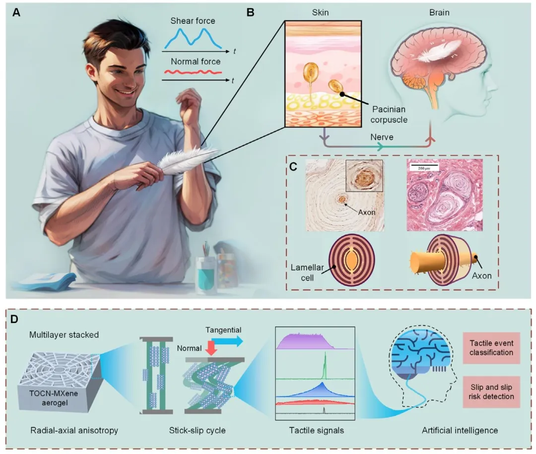 图1 帕西尼小体(PC)与人工帕西尼小体(APC)的结构及功能 A)羽毛滑动作用下人体触觉感知的示意图。人体图像基于作者手绘草图,使用ComfyUI(v0.3.59版本)结合Stable Diffusion 3与rpg_V4模型生成(访问时间:2024年10月),内容由作者指导并审核。 B)帕西尼小体(PC)的放大示意图:PC位于真皮层,对振动敏感,可实现机电转换功能。 C)左上角:人体手掌腱膜中帕西尼小体(PC)的切片图像,显示Piezo2蛋白的定位情况,插图为核心处的轴突;右上角:人体皮肤切片中的帕西尼小体(PC)簇(经许可转载[30],2018年,Springer出版社);底部:帕西尼小体(PC)内部区域的正视图与侧视图示意图。 D)本研究设计的触觉传感器:基于TOCN-MXene气凝胶的人工帕西尼小体(APC)可实现触觉事件分类及滑移/滑移风险检测。