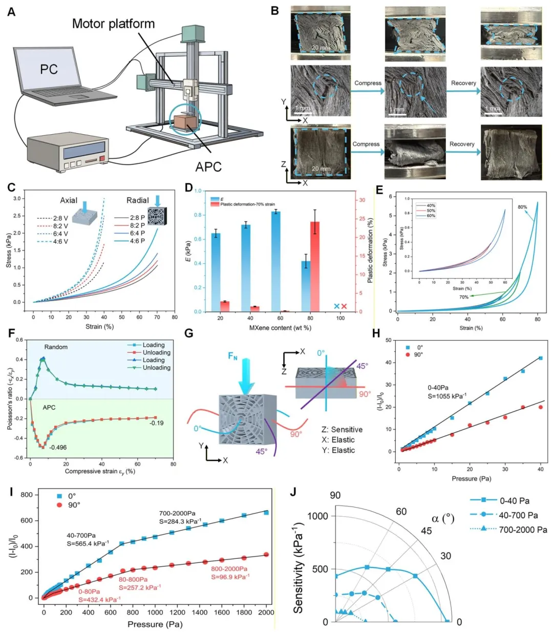 图3. 人工帕西尼小体(APC)的力学性能与压阻性能 A)用于测量APC力学性能与压阻性能的定制化测试平台示意图。 B)APC在径向压缩下的变形图像(上图)、径向压缩与恢复过程中的金相显微镜图像(中图,比例尺:1毫米),以及轴向压缩与恢复过程中的变形图像(下图)。 C)不同MXene含量(20%、40%、60%、80%)的APC在轴向与径向压缩下的应力-应变曲线。 D)轴向压缩(应变70%)条件下的弹性模量(E)与塑性变形。误差线代表5次测量中弹性模量(E)与塑性变形的标准差(SDs)。 E)APC在应变高达80%的循环加载下的滞后曲线。插图:应变高达60%的循环加载下的滞后曲线。 F)APC及对照样品在应变高达70%的加载-卸载循环中泊松比(Poisson's ratio)的变化。 G)APC方向敏感性示意图:沿y轴施加径向压缩时,在0°(z轴方向)灵敏度最高,且随测量方向向90°(x轴方向)旋转而降低。 H)沿0°方向,APC在0-40帕压力下的相对电流变化((I-I₀)/I₀)与力灵敏度;I)沿0°和90°方向,APC在0-2000帕全压力范围内的相对电流变化与力灵敏度。 J)不同压力与方向角(最高90°)下灵敏度的极坐标图。