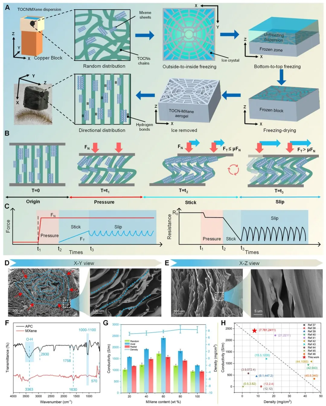 图2. 人工帕西尼小体(APC)的制备、作用机制及表征 A)APC的制备过程示意图。将APC置于狗尾草(Setaria viridis)上,以展示其超轻特性。 B)APC仿生层状结构在外力作用下的变形过程,涉及无载荷状态(T=0)、法向力作用状态(T=t₁)、切向力作用下的粘滞状态(T=t₂)及滑移状态(T=t₃)。 C)不同变形过程中法向力与切向力的变化(左图),以及APC对应的电阻响应(右图)。 D)APC在X-Y平面(径向)的扫描电子显微镜(SEM)图像;E)APC在Y-Z平面(轴向)的SEM图像。 F)MXene材料与APC的傅里叶变换红外(FT-IR)光谱。 G)不同MXene含量下,APC及对照样品的轴向与径向电导率。折线图代表APC的密度;误差线代表5次密度测量结果的标准差(SDs)。 H)本研究制备的APC与已有文献报道气凝胶在电导率和密度方面的对比分析。
