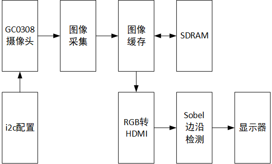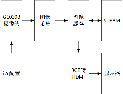 这里与前面的彩条HDMI输出不同的是将彩条视频换为了真实的GC0308摄像头,并加入了i2c摄像头配置、图像采集等功能。
