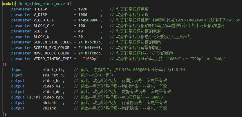 我们设计了一个动态彩条来模拟一个视频信号,动态彩条设计遵循工程设计要求,具有通用性、实用性和移植性等特点,动态彩条顶层接口如下: