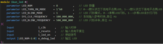 流水灯设计之于FPGA开发,好比打印hello word之于软件开发,他本身没有多大工程价值,却实走进FPGA开发世界的大门,所以,学好流水灯也不能说毫无意义,关键在于如何用工程师思维设计出通用性强、代码维护性好、多功能、好用的LED模块,基于此,我们提供给鸽鸽的LED流水灯例程打破友商常规,直接给高价值的LED流水灯,可能你会疑问,一个LED流水灯还能搞出什么新鲜玩意,那么请看我的流水灯顶层接口,你可曾见过?