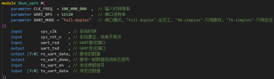 相比流水灯,串口收发就有用点了,串口收发例程可以让你学会串口接收和发送的设计方法,并将接收和发送回环起来,利用串口调试助手便可轻松玩转串口,我们提供给鸽鸽的串口收发例程打破友商常规,直接给高价值的串口收发,可能你会疑问,一个串口收发还能搞出什么新鲜玩意,那么请看我的串口收发顶层接口,你可曾见过?
