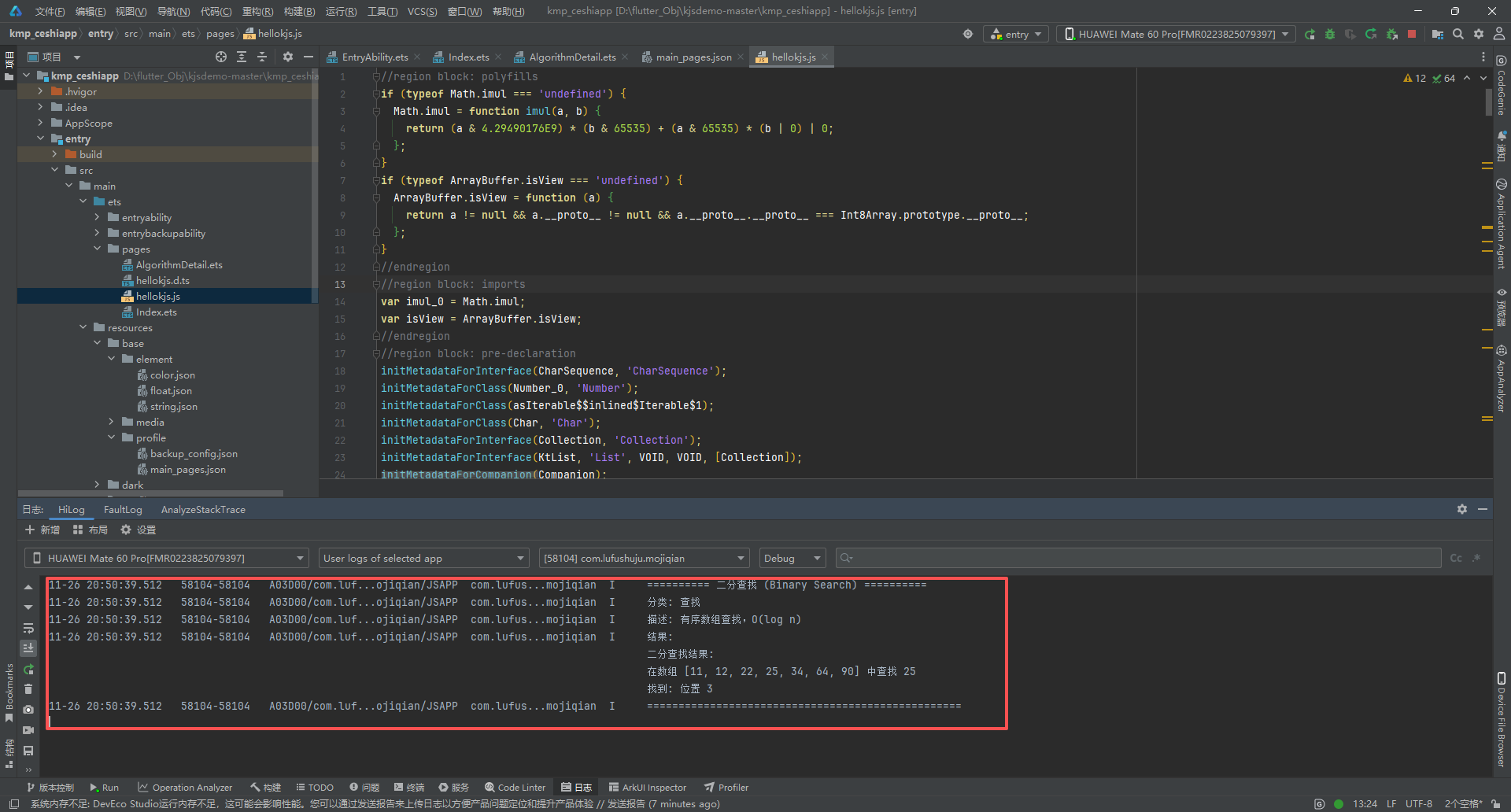 二分查找是一种高效的查找算法,适用于已排序的数组。通过不断将查找范围缩小一半,快速定位目标元素。本文将展示如何使用 Kotlin Multiplatform (KMP) 实现二分查找,并通过 JavaScript 编译后在 OpenHarmony 应用中调用。
