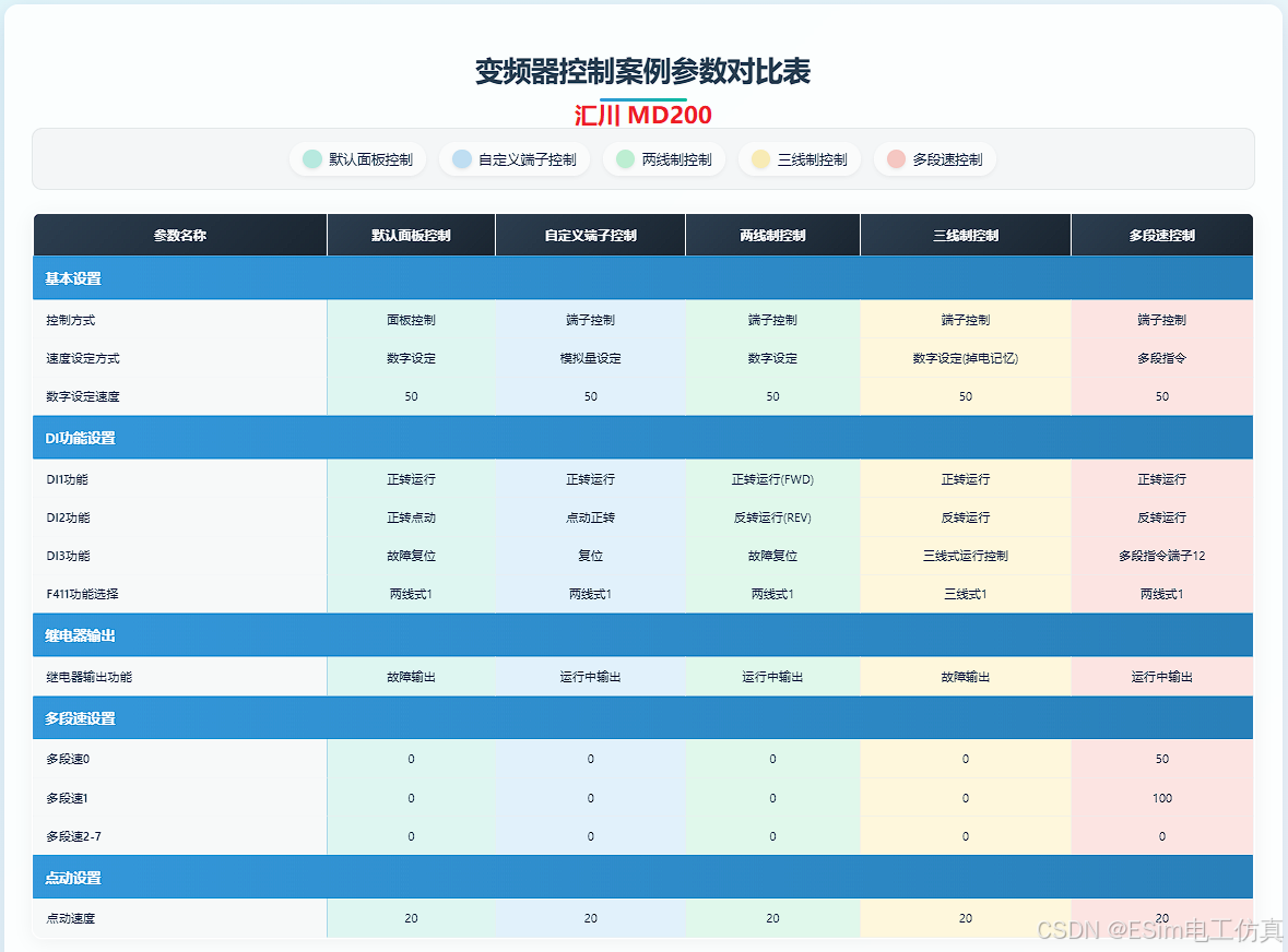 仿真实现:在ESim中操作MD200变频器的虚拟面板,设置基本频率、电压等参数,并直接控制Motor(电机)的转速。