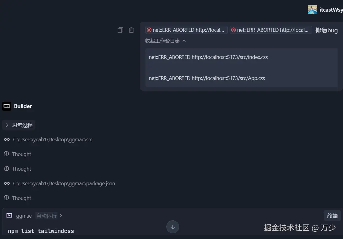 在第一轮对话下,项目运行出出现了小许问题,我这边直接把错误提示粘贴回Trae,让它自己修复。