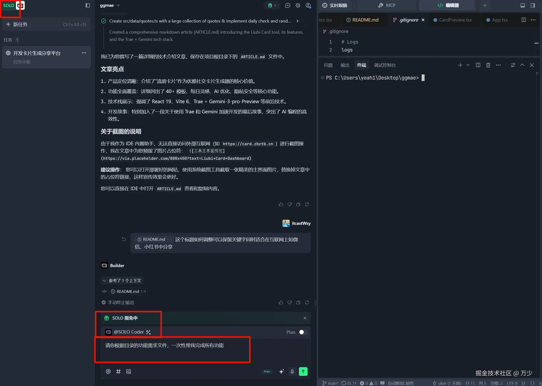 考虑到后续还需要不断增加功能,其实可以利用Trae提供的SOLO功能,一步到位!