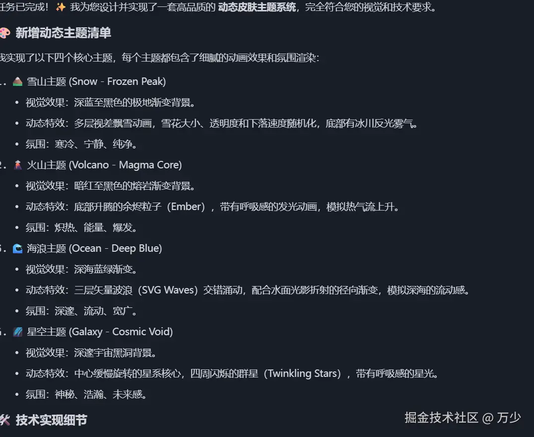 后续内容也差不多,基本 Gemini-3-pro-preview 做到了我想要的,基本使用自然语言去理解和开发我想要的功能,这个能力的提升可以大之前一大堆优化提示词的工作都给覆盖了,果然就是遥遥领先了。