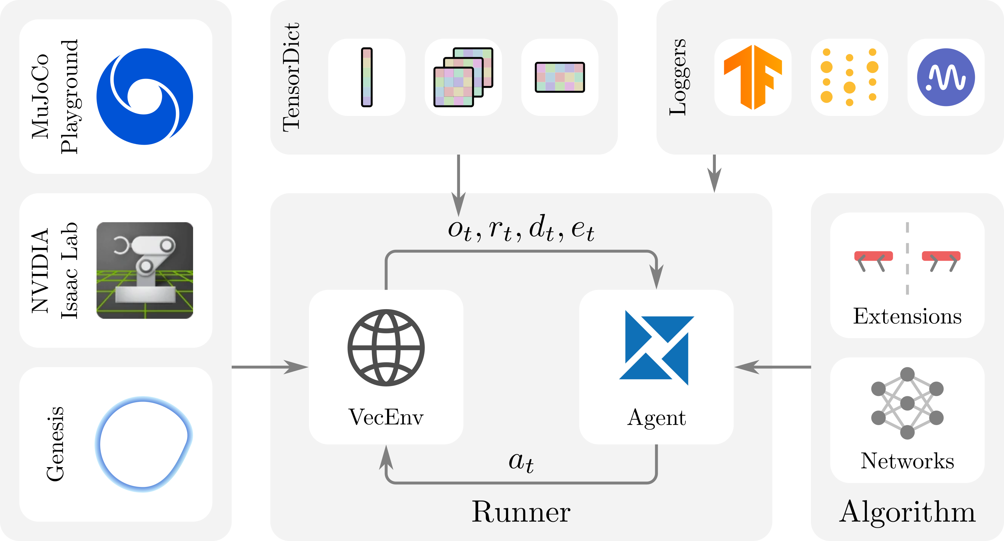 框架定义了专属的VecEnv接口,要求环境实现同步重置模式(Towers et al., 2024)。step方法必须返回PyTorch张量,观测数据需以TensorDict结构呈现(Bou et al., 2023)。TensorDict为批量张量提供灵活的字典式容器,支持观测组件向不同网络模块的可选路由,并天然兼容RND或潜在重建等正则化辅助技术。