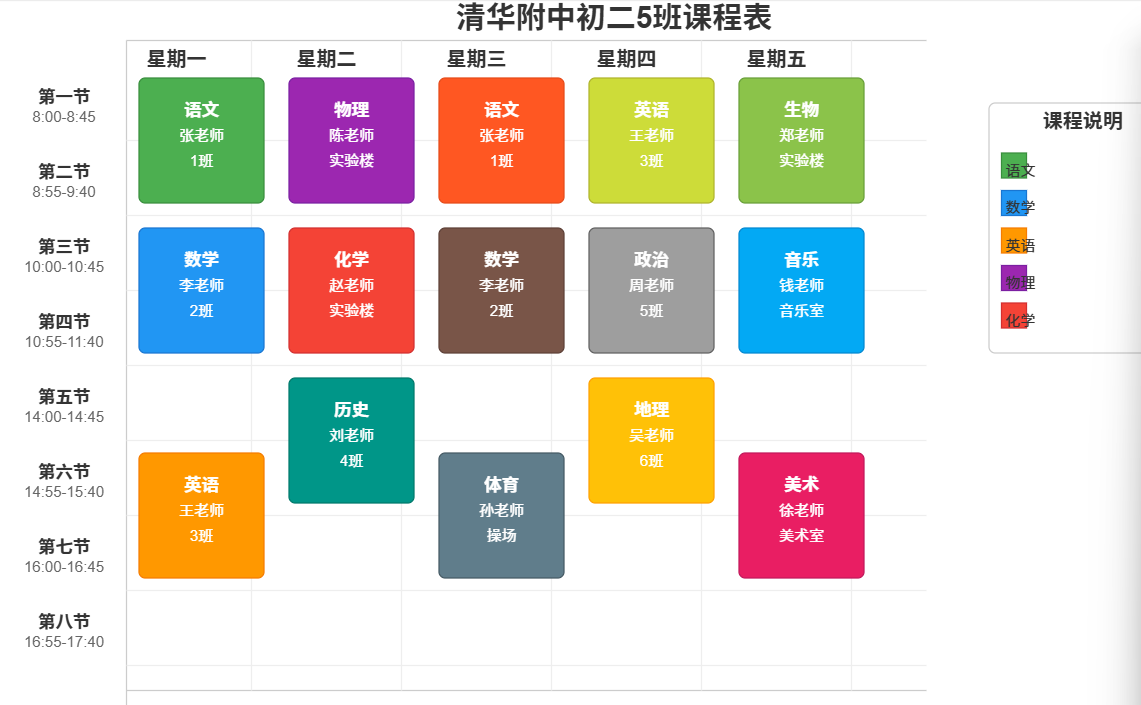 鼠标悬停高亮:课程块颜色渐变+微缩放,交互反馈清晰