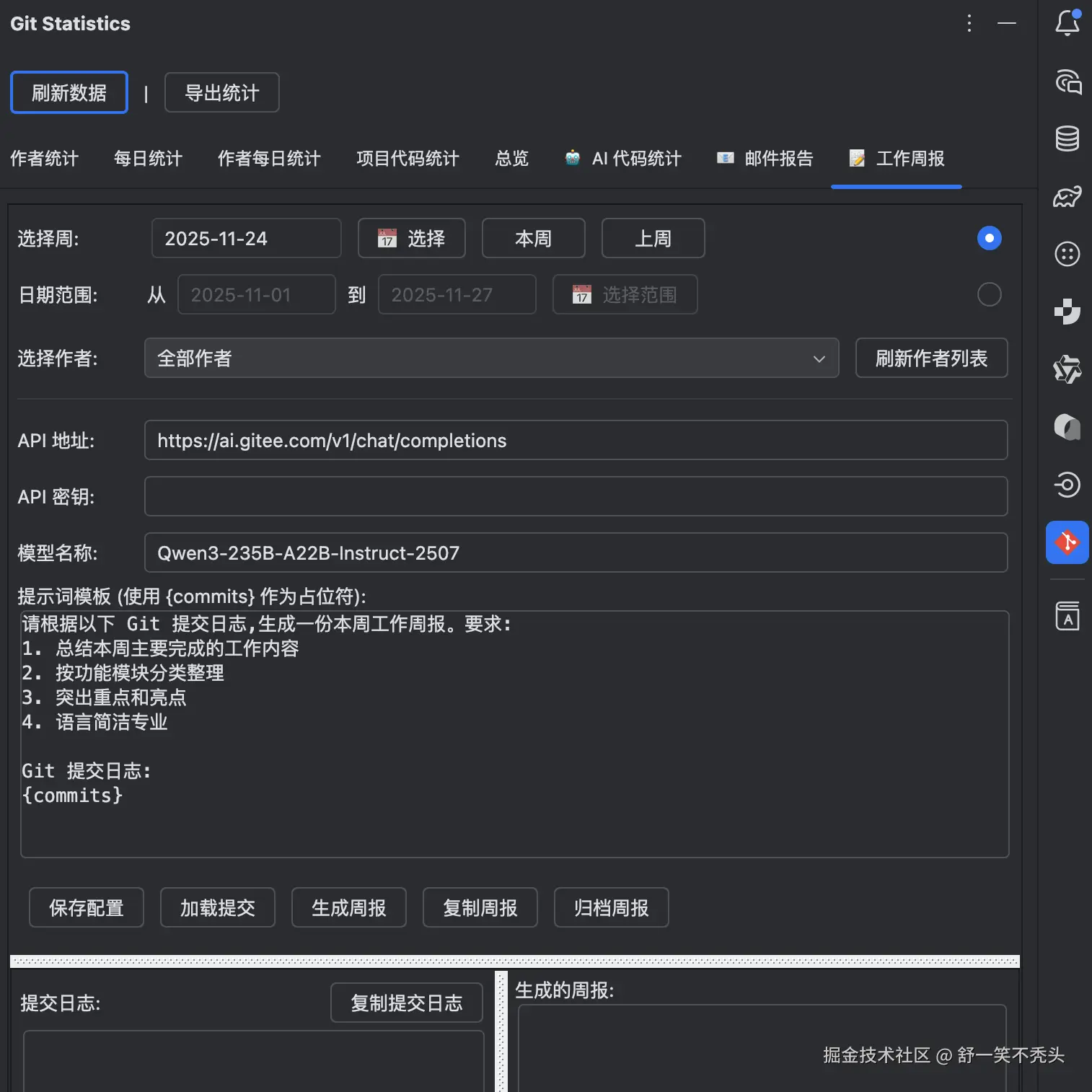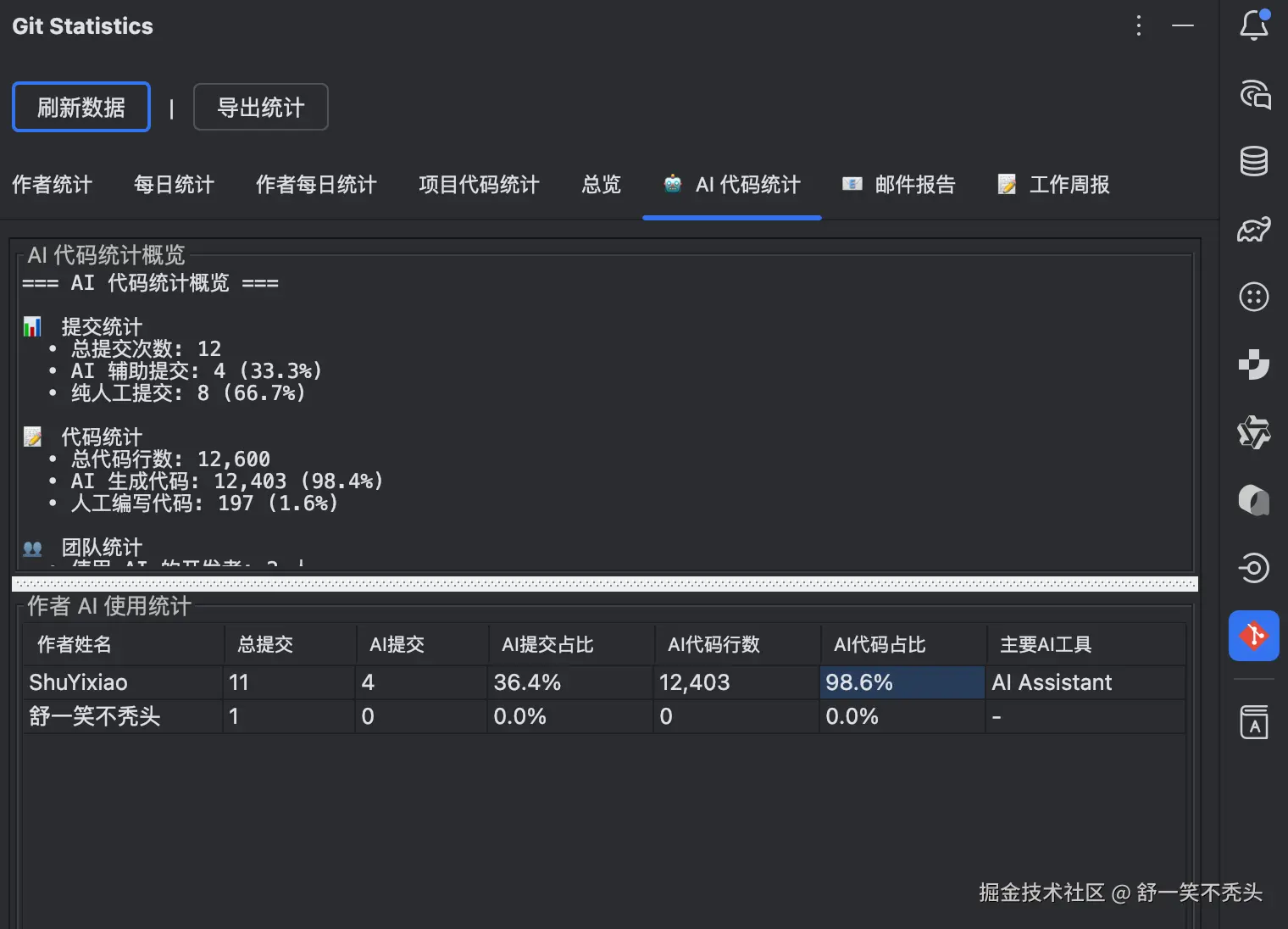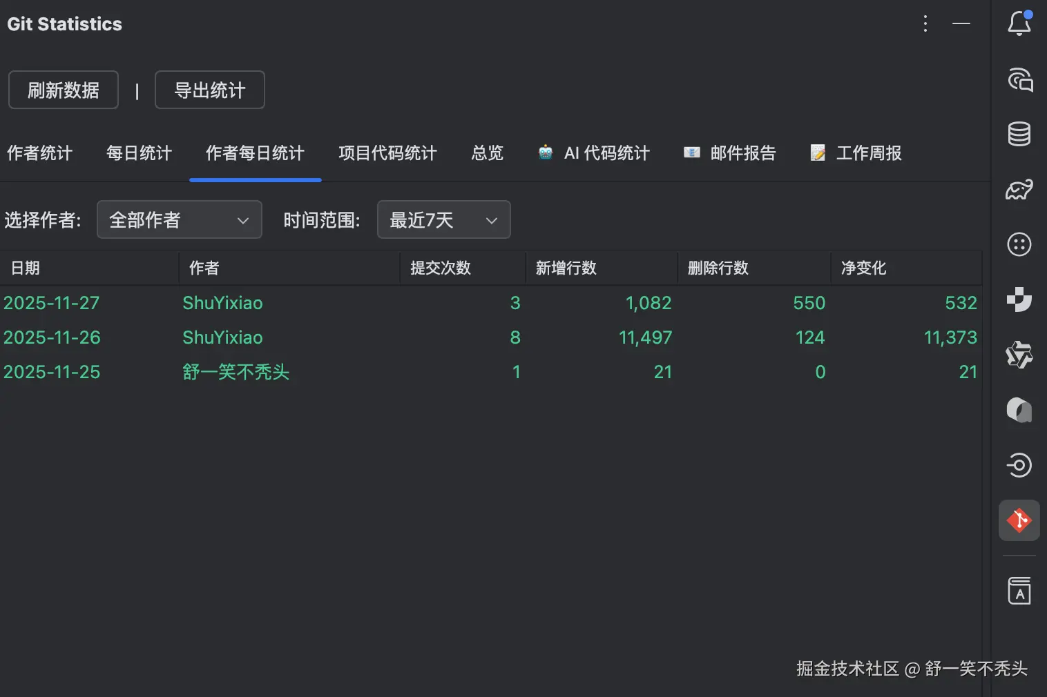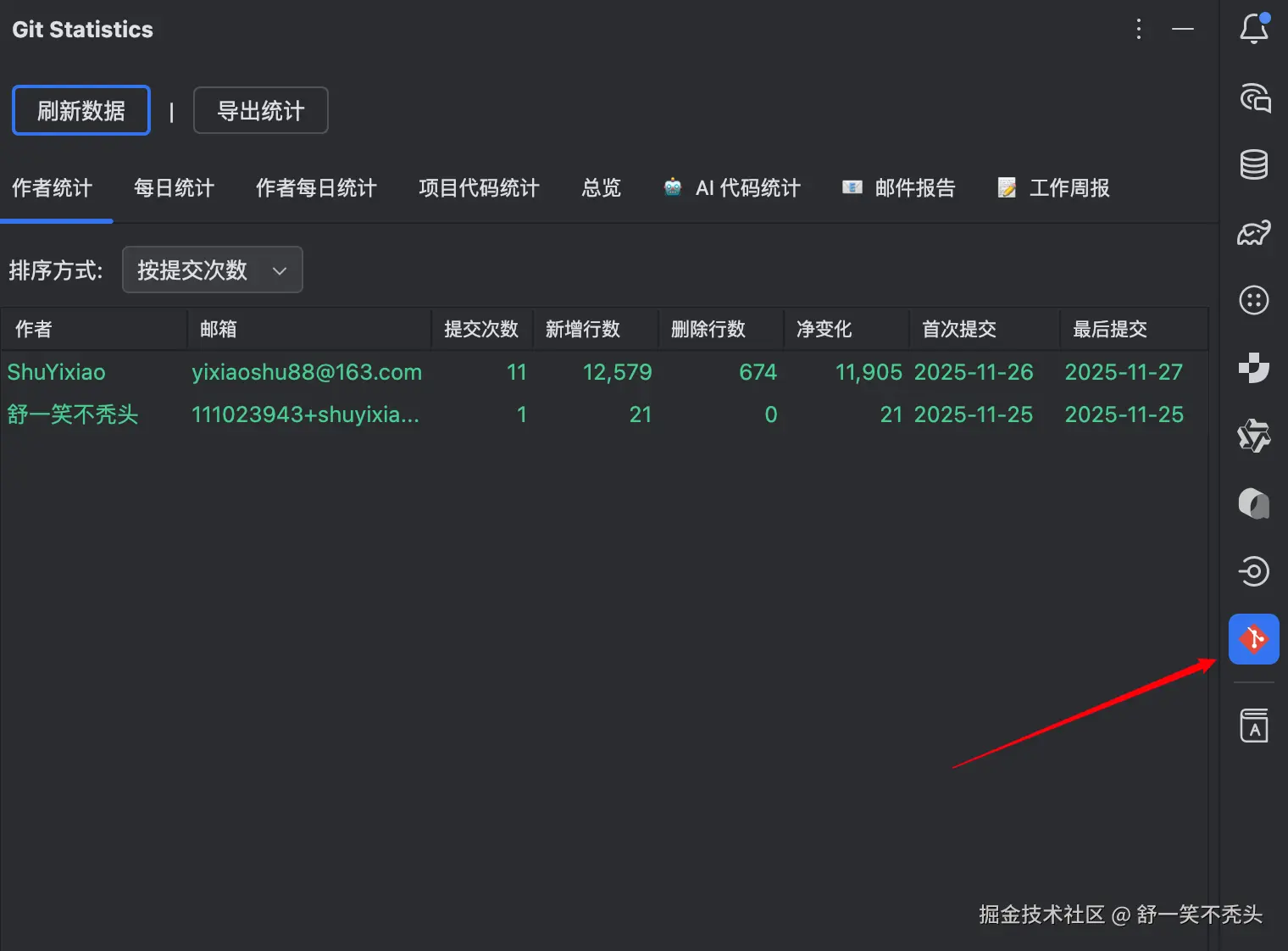 - 打开 :IDE 右侧工具栏点击 "Git Statistics"