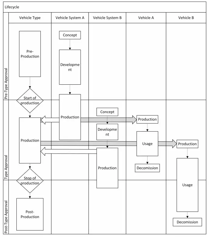 对于这些流程,我们需要区分汽车领域中不同的生命周期定义(见图 3)。根据联合国欧洲经济委员会(UNECE)法规,生命周期指车型的生命周期,例如从开发、量产启动到停产。而在 ISO 26262和 SAE J3061中,生命周期侧重于可用于多款车辆的系统(元件、组件)的工程设计过程。对于车辆本身而言,其生命周期包括生产、使用和报废阶段。为获得型式认证(例如启动量产),原始设备制造商(OEM)需证明其自身及所有相关供应商均已获得网络安全管理系统(CSMS)认证。