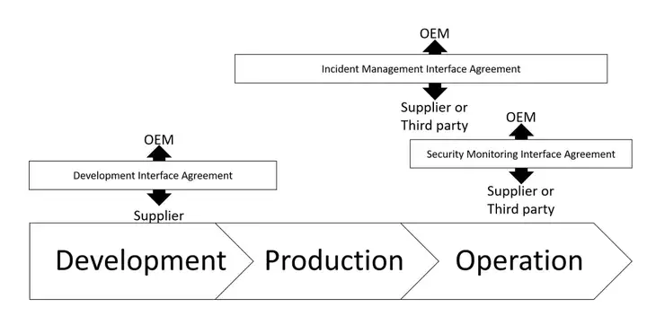 在汽车领域的合作中,确保供应商网络安全能力的方法可基于现有的能力评估方案。例如,原始设备制造商(OEM)可要求其供应商通过 TISAX 评估来证明其系统的信息安全水平,以确保关键信息得到保护。可通过基于 IEC 62443的环境评估来证明生产环境的安全性。扩展了安全要求的汽车 SPICE 评估也可用于流程评估。