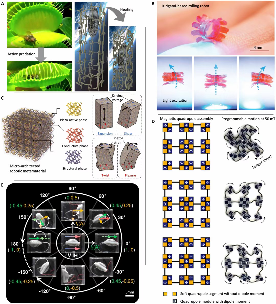 图6:基于响应式超材料的超材料机器人技术(A) 由恒温金属带构成的温度响应超材料,在极端温度环境下表现出主动捕食行为。(B) 光响应剪纸构成毫米级滚动机器人,其运动由光激发方向控制。© 具有各种应变模式和压电应变矩阵的压电超材料。(D) 磁响应晶格形成由被动和主动(具有偶极矩)四极子构成的可编程执行器,其可编程运动由磁化方向控制。(E) 具有自导向控制和高维操作能力的电磁软执行器模块,能够形成具有多模态运动能力的模块化机器人。