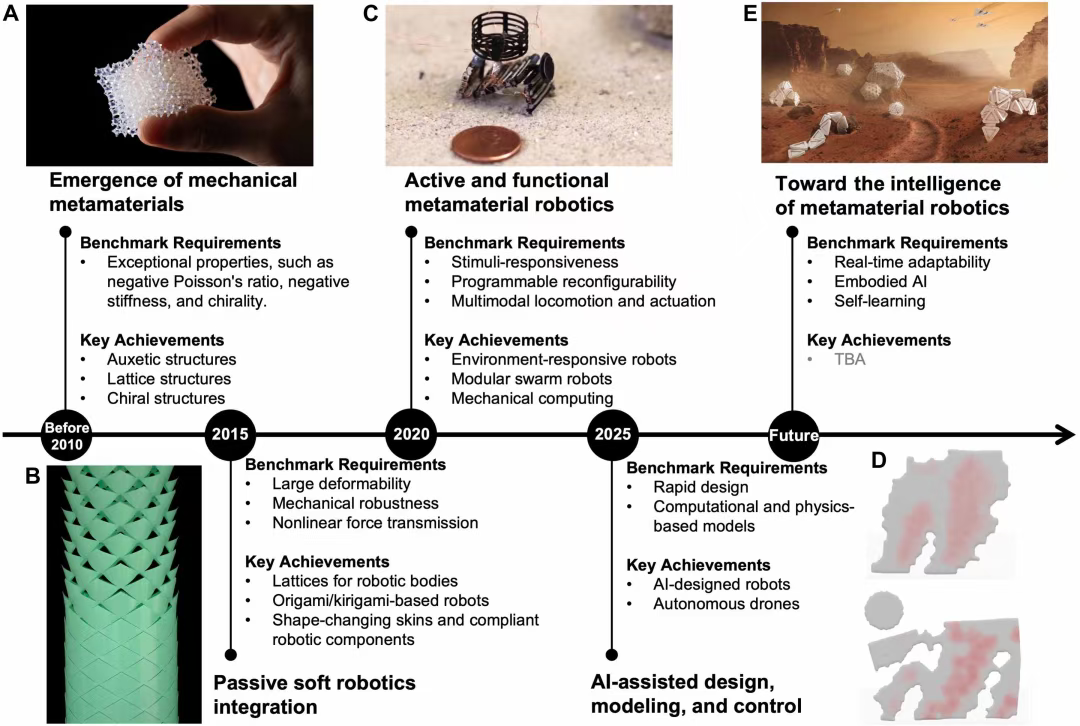 该领域的发展从早期利用超材料获得优异机械性能(如轻质、大变形),演进到利用响应式材料实现环境感知与自适应运动。如今,结合人工智能进行设计与控制,其终极愿景是创造出能够像生命体一样,在复杂未知环境中自主适应、学习和演化的智能机器系统,从而模糊了材料、结构与智能之间的界限。