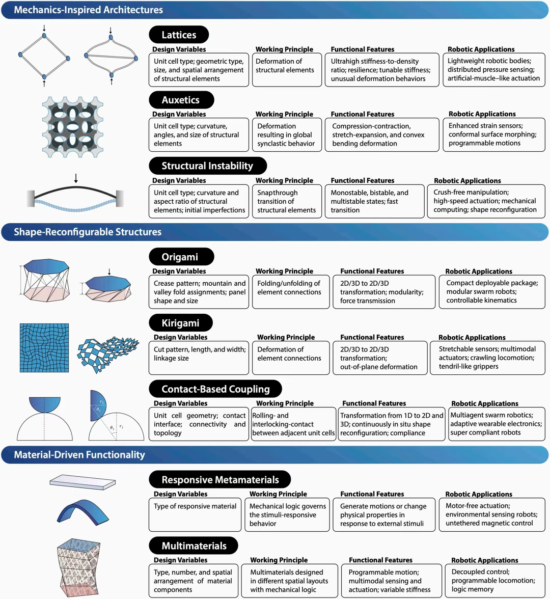 图3:用于机器人技术的超材料设计原理图示了三个主要类别:力学启发架构(晶格、拉胀结构和结构失稳)、形状可重构结构(折纸、剪纸和接触式耦合)以及材料驱动功能(响应式超材料和多材料)。重点展示了每种设计原理的设计变量、工作原理、功能特性和机器人应用。