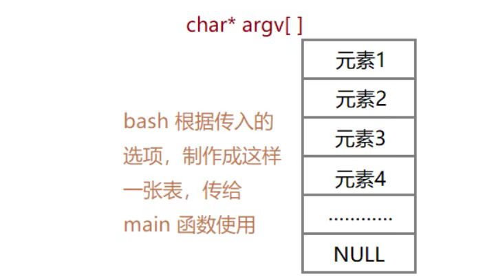 char* argv[] 传入程序中的元素表,由 bash 制作,传给 main 函数