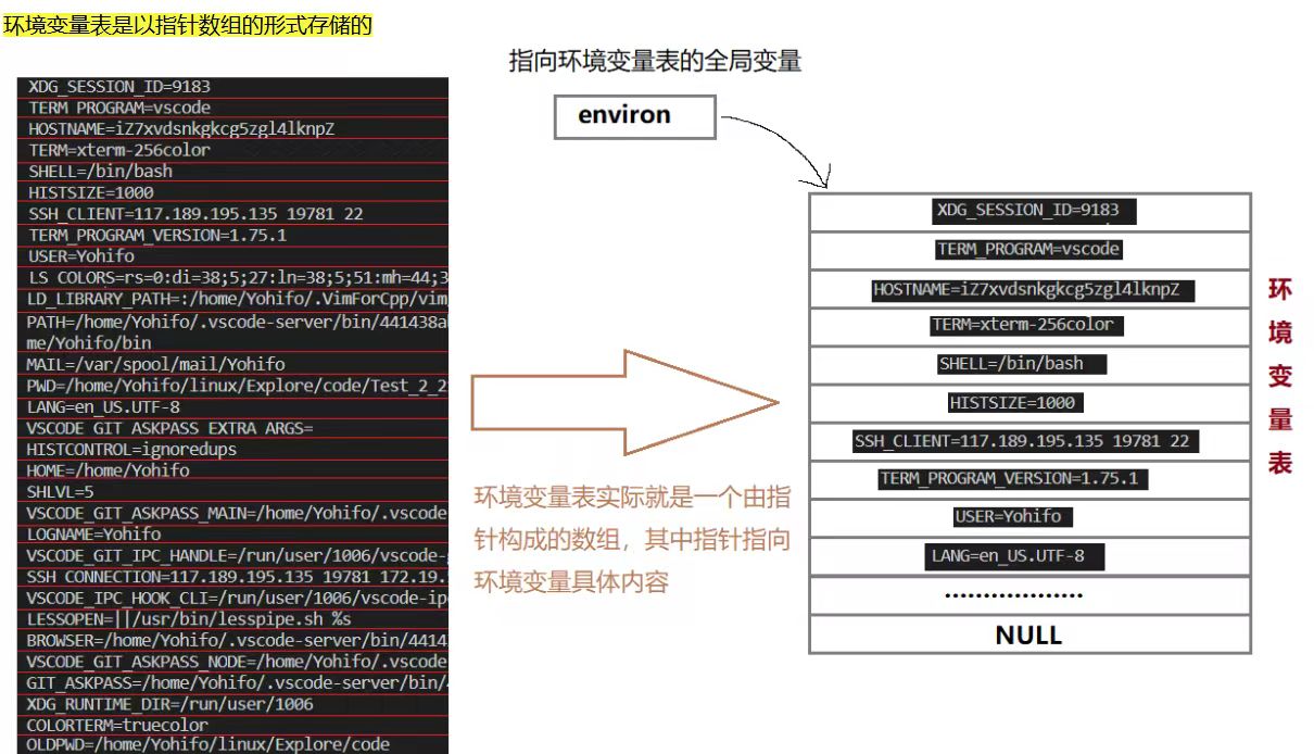 每个程序都会收到一个环境变量表,环境表是一个字符指针数组,每一个指针都指向一个以'\0'结尾的环境字符表。