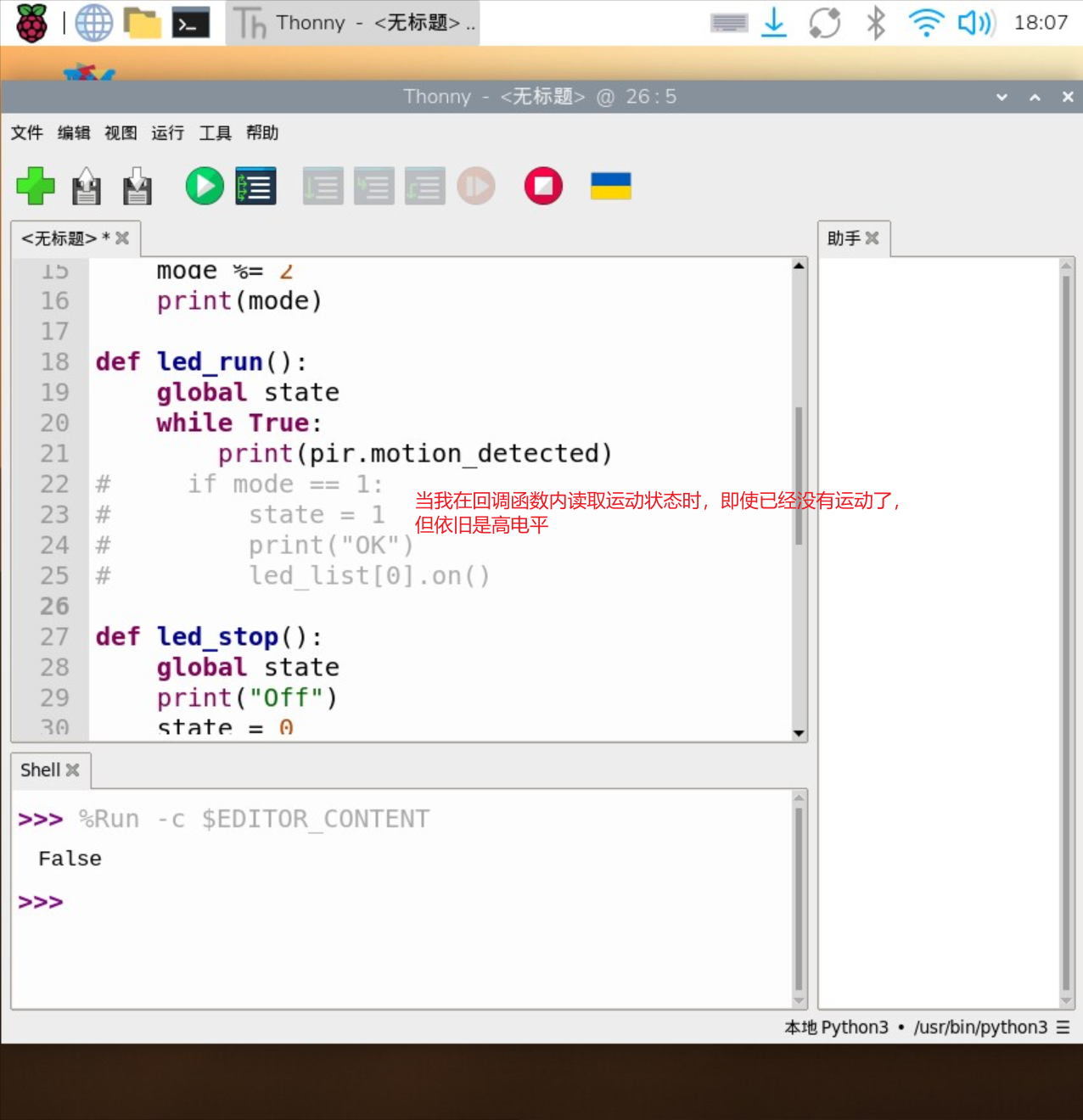 甚至是我已将引脚连线拔出,依旧显示高电平,无法进入后续不运动的回调函数(已尝试在未运动函数中读取,现象对称------只有低电平),但在按键回调中读取按键状态并不会有这种情况。我目前认为是在运动传感器状态下的回调函数如果未执行完,就会强制性读取相应高低电平,求大佬解答。