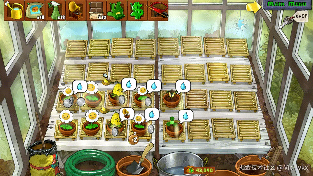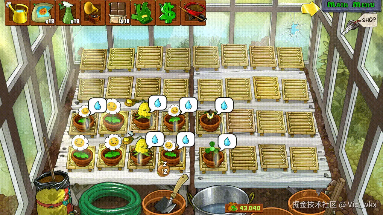 于是我给花洒设置了一个 W 的快捷键(Water a plant!),点一下键盘上的 W,鼠标就能自动移到花洒的位置,执行一次点击,然后再回到原位,这样浇起水来就相当丝滑了: