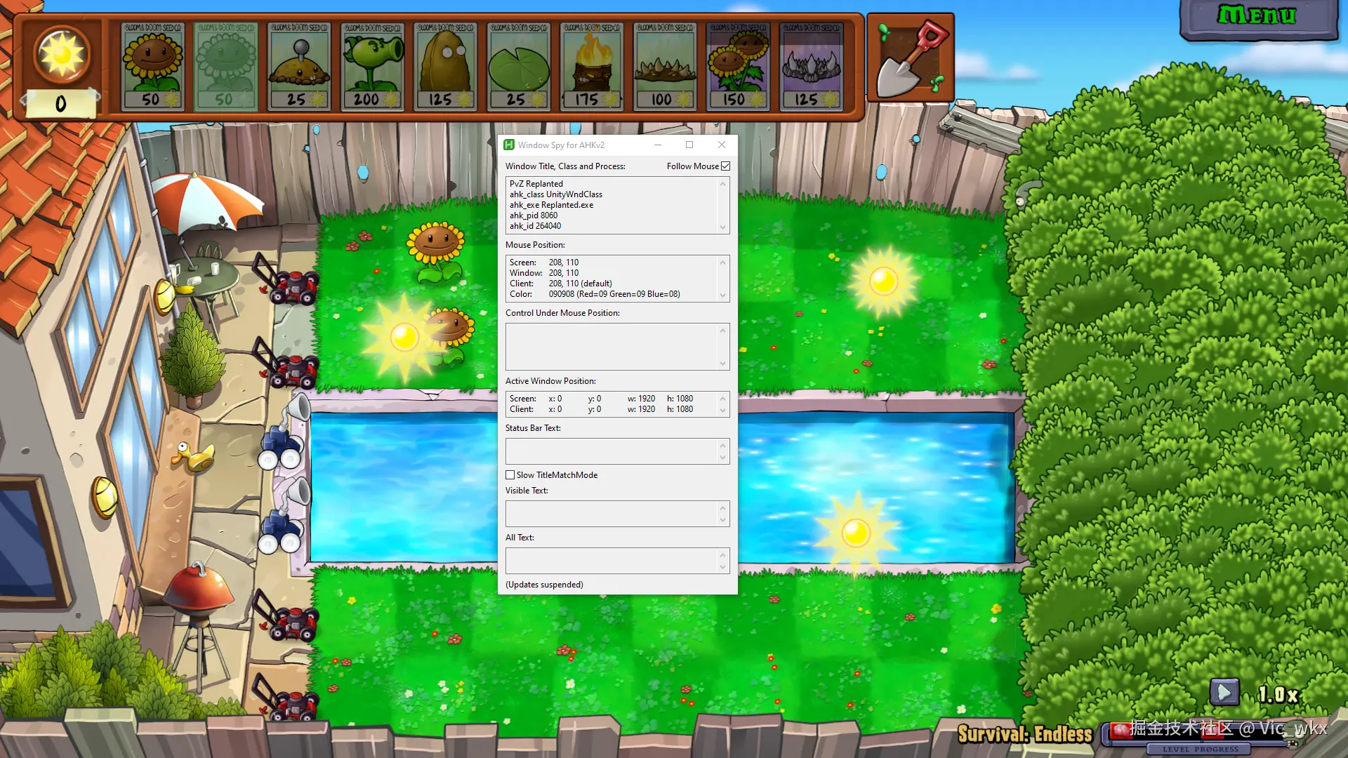 这个脚本有一个作用:查看鼠标当前所在的位置坐标。在 Mouse Position 这一栏,Screen 的值会随着鼠标的移动而变化。比如,将鼠标移动到卡片槽里的向日葵的位置,可以看到这里的坐标显示 208, 110,这个坐标我们待会自己写脚本时需要用到。