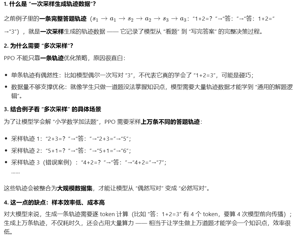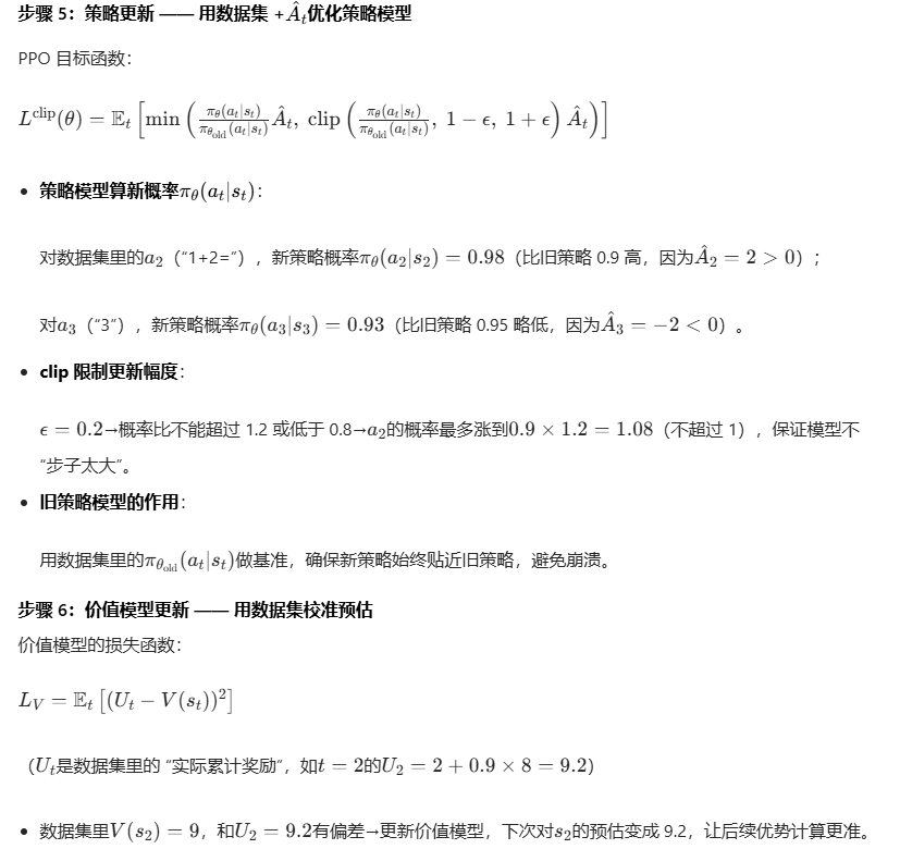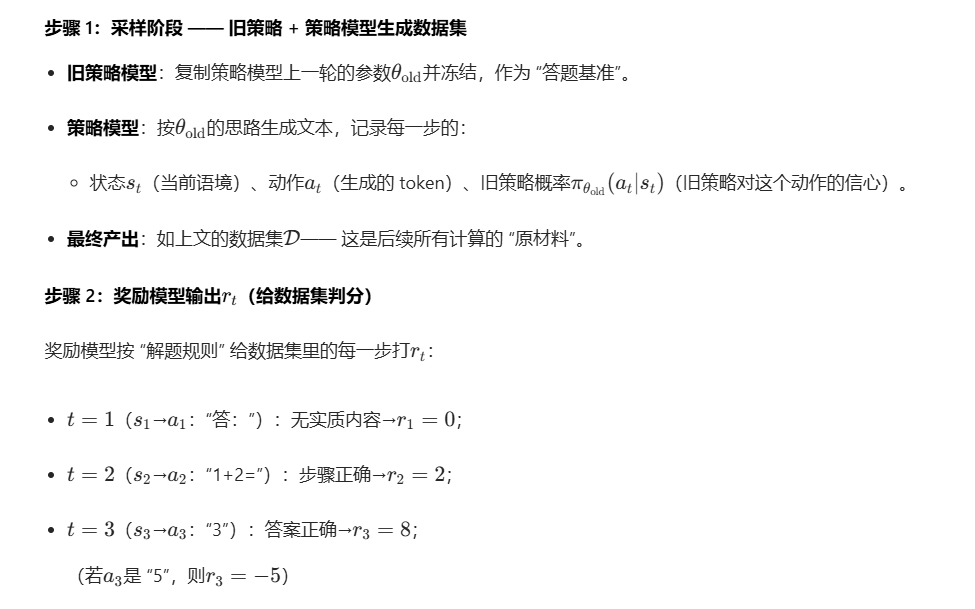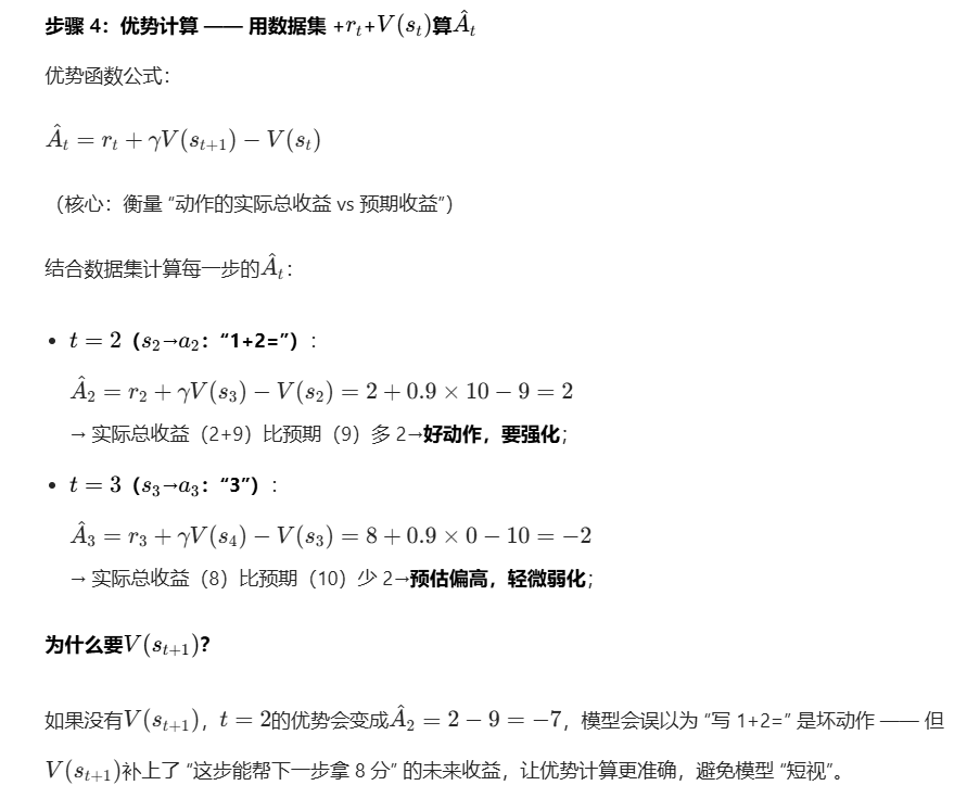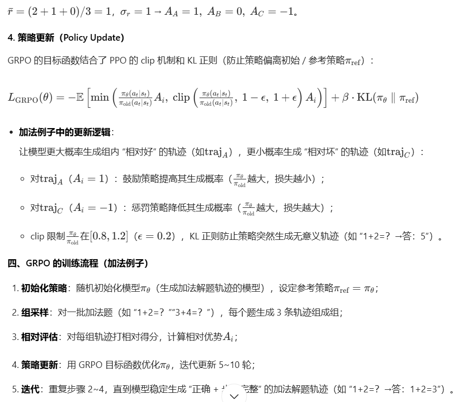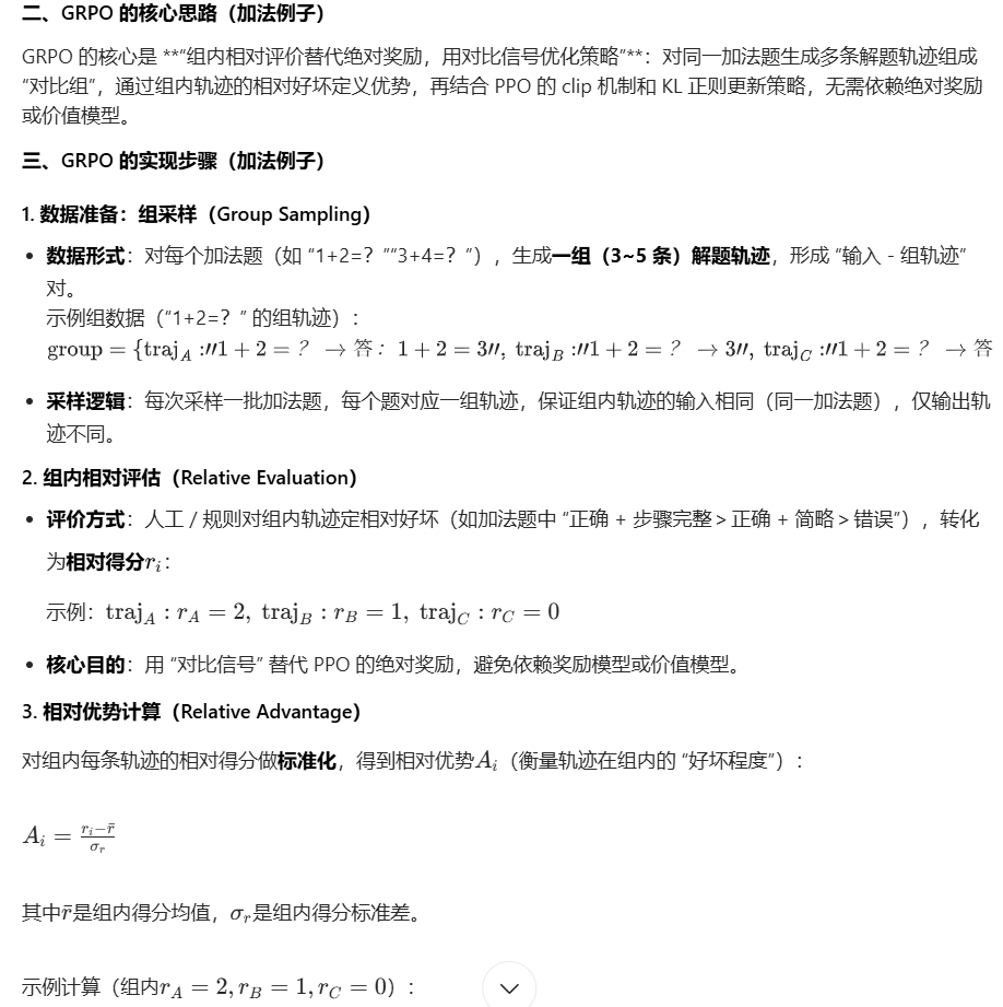GRPO 就解决了这个问题:它不需要奖励模型给 "绝对分数",只需要把 "同一道题的 3 种解法放在一起对比"(比如 "4+2=6" 比 "4+2=7" 好,"步骤详细的解法" 比 "步骤简略的解法" 好),就能让模型学会改进 ------ 相当于学生不用做上万道题,只需要对比几道题的解法优劣,就能学会知识点,效率高得多。